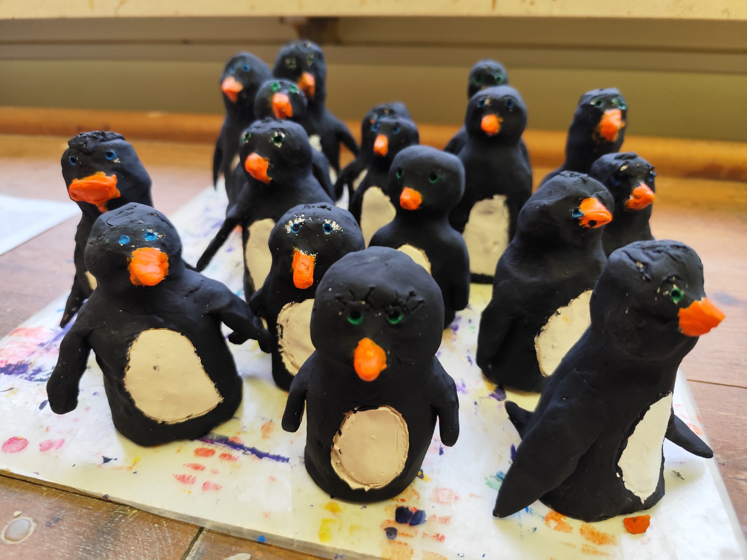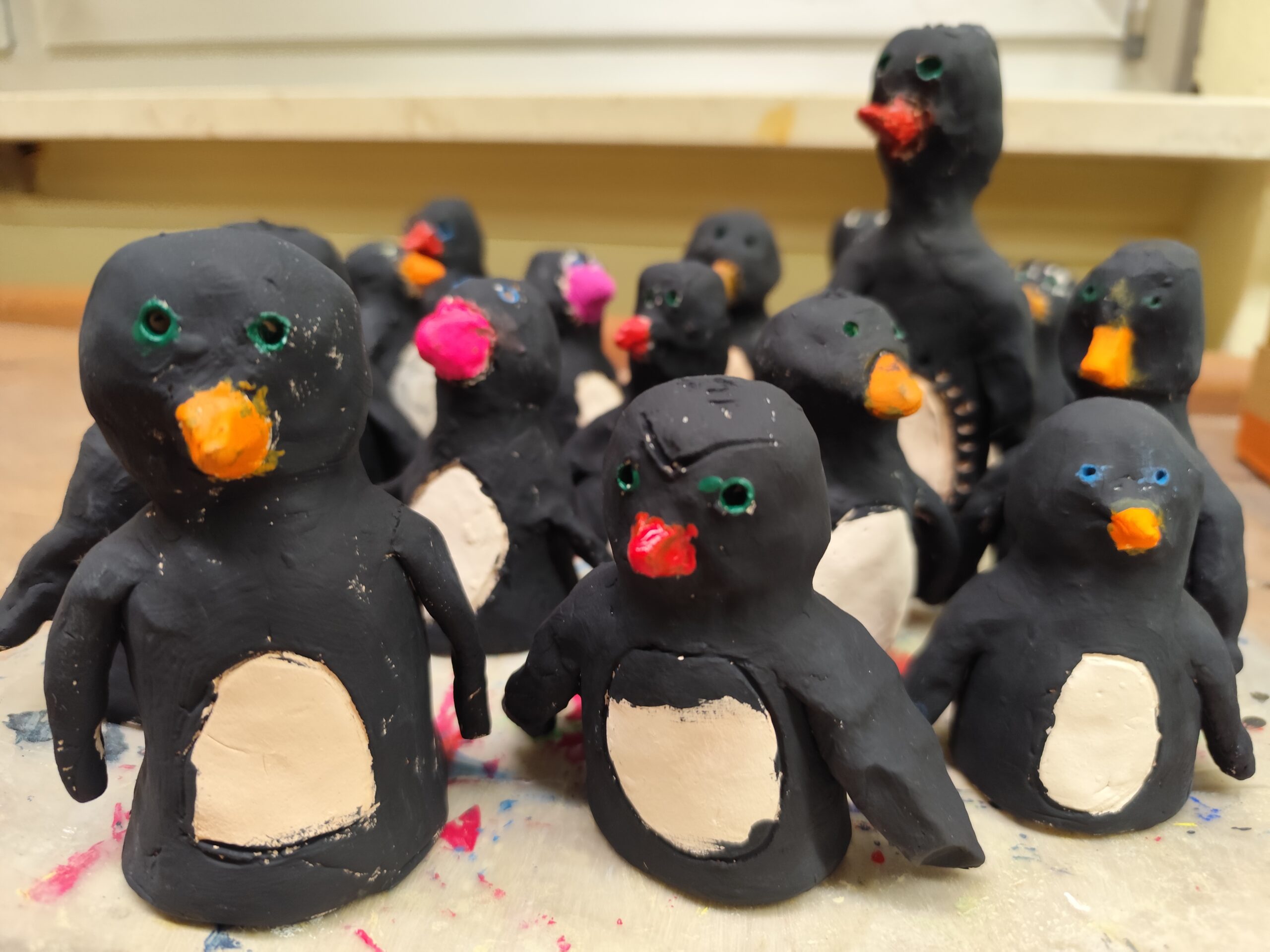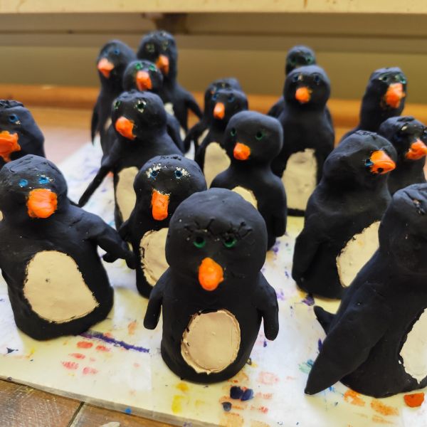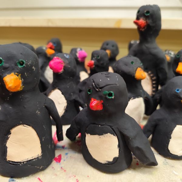 Mit diesen lustigen Pinguinen ,die die Klassen 3a und 3b im Werkunterricht aus Ton hergestellt haben, kann der Winter nun kommen.